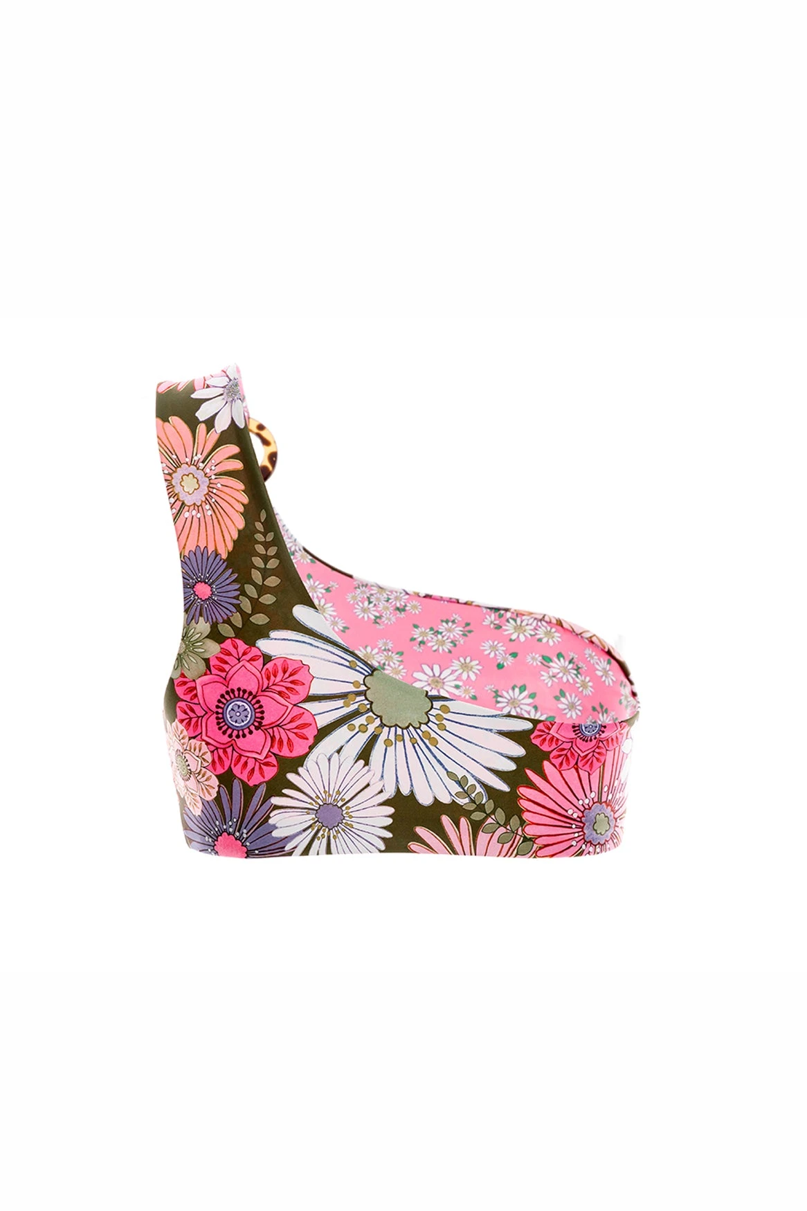A reversible key look made with eco fabric. The Clori one shoulder bikini top is available in plus-size sizes. Inspired by a utopian summer paradise and unexpected beauty. The ideal Pacific destination. A trip to the past, where summer is interpreted from the iconic Surf Vibe, retro and futuristic. Different kitsch Hawaiian flowers mixed with the undertones of the sea, nature, and mountains of Hawaii. Flowers such as orchids, plumerias, ferns, and hibiscus and colors such as quartz, olive, bone white, sky, and jade. This piece is perfect for all bodies!