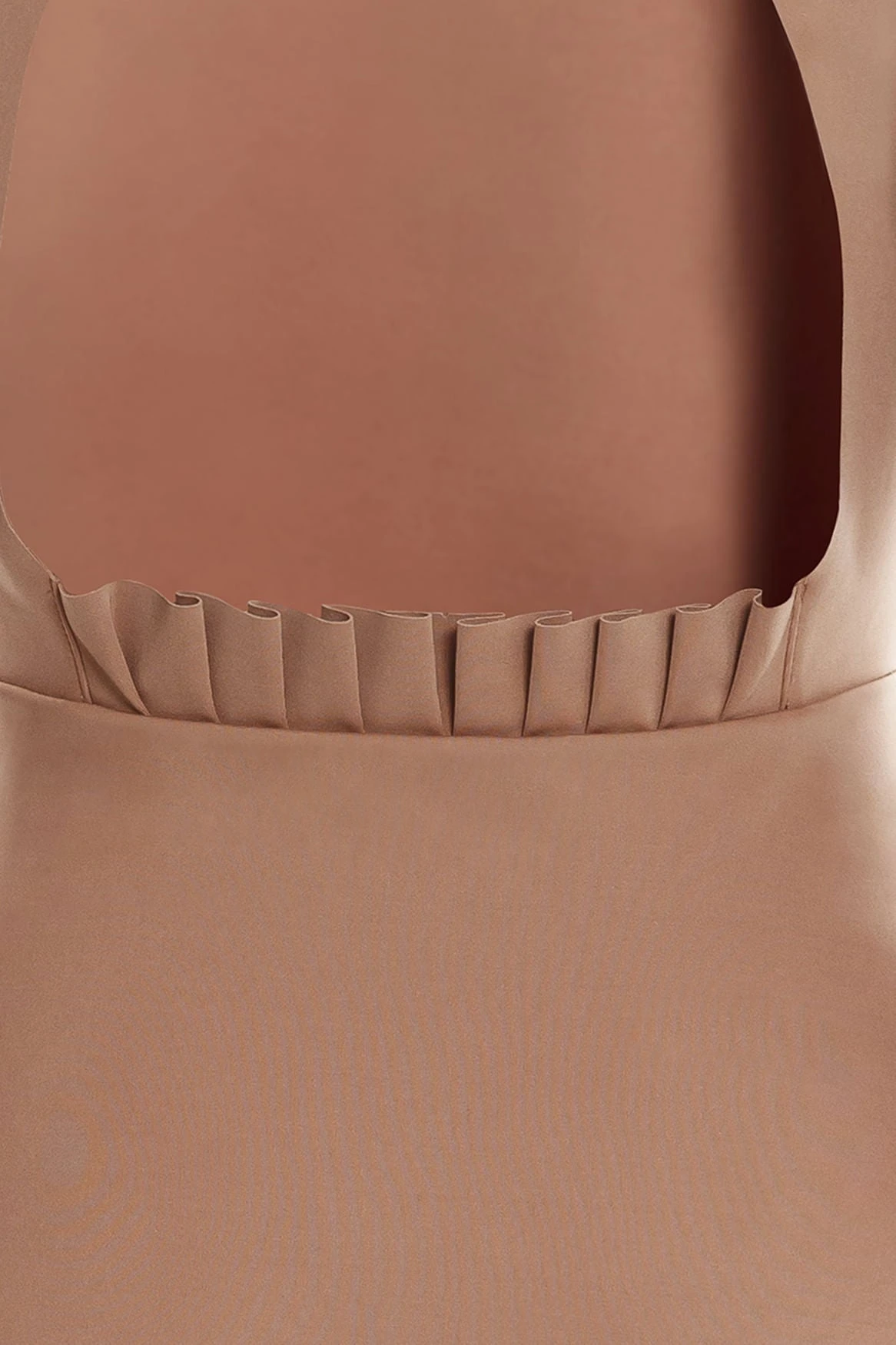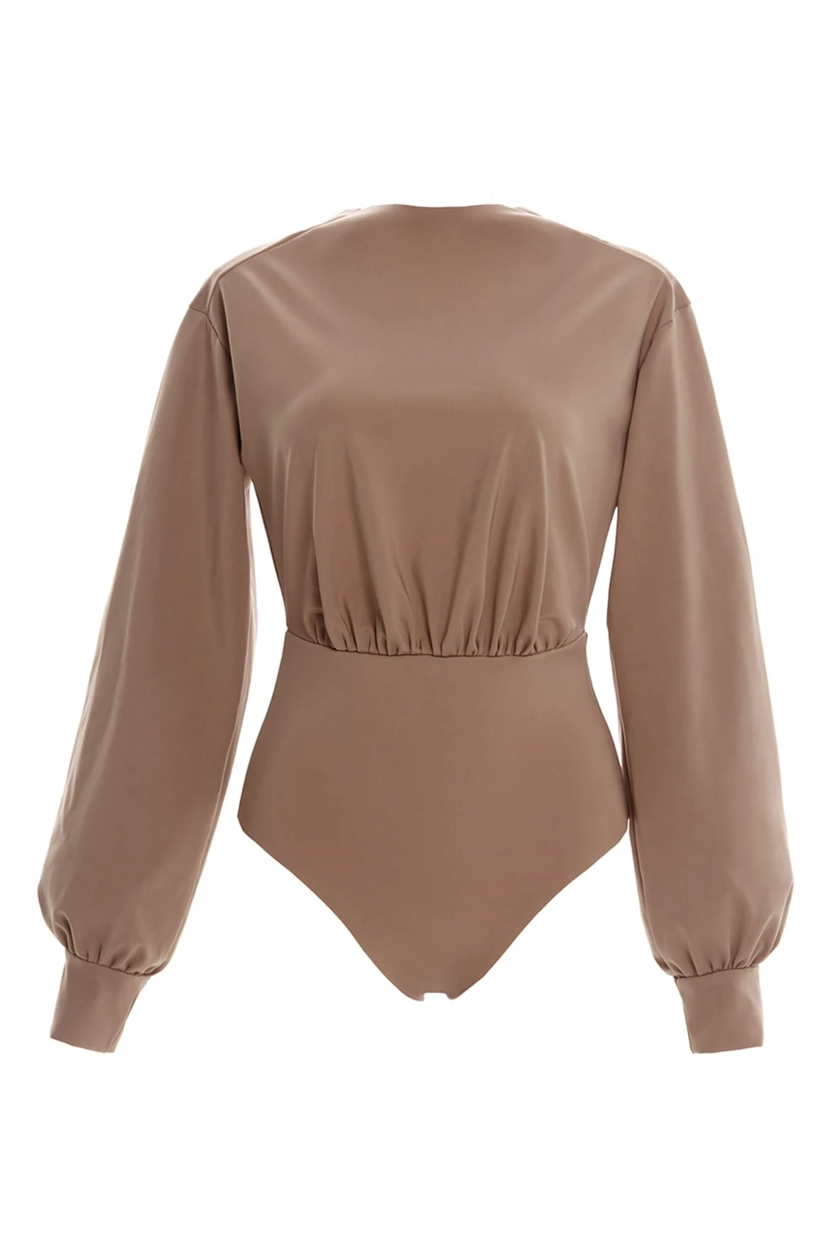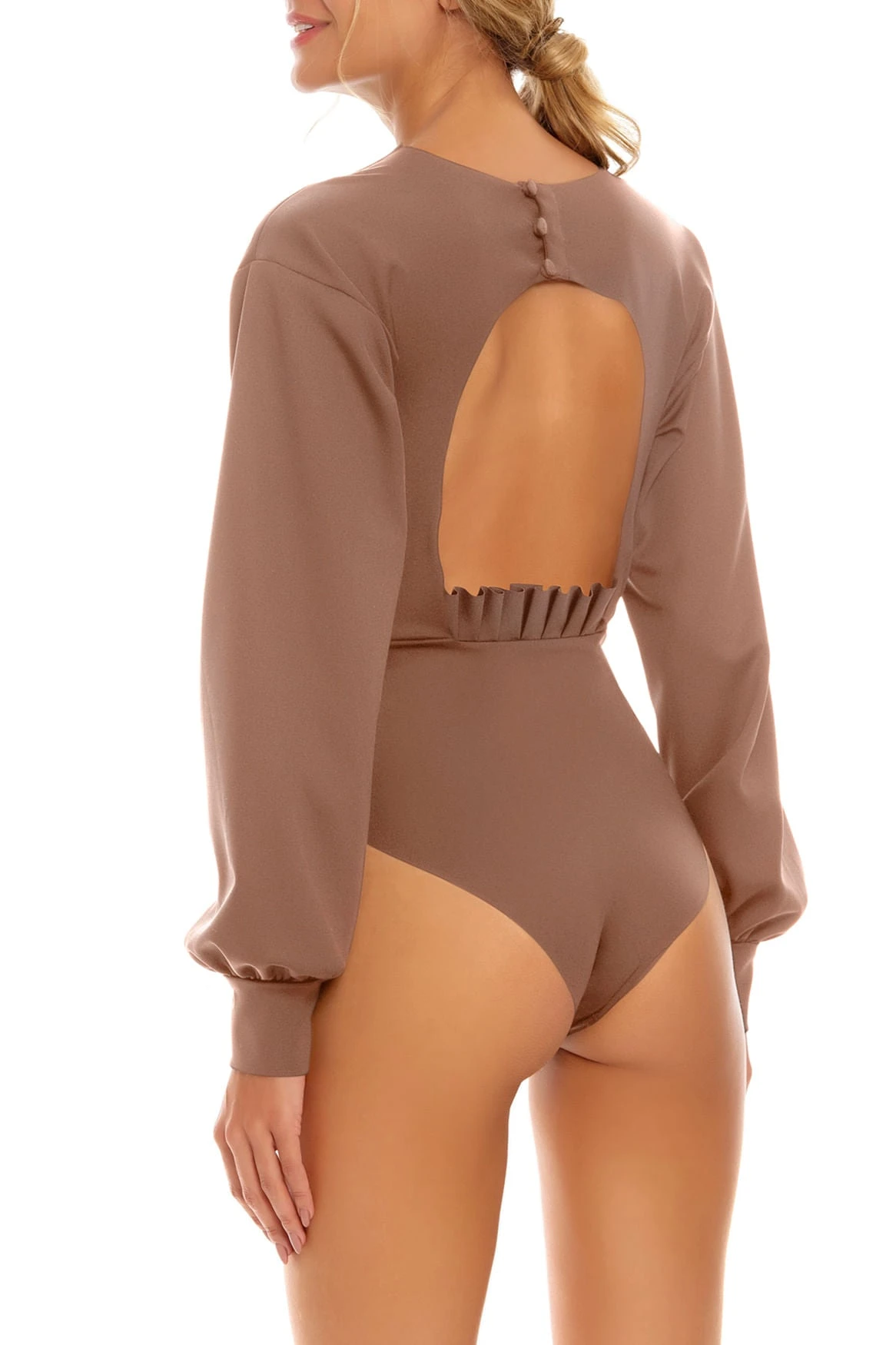 Open-backed high neck bodysuit with long sleeves accented with cuffs. Feminine detailing, Latin coverage.
