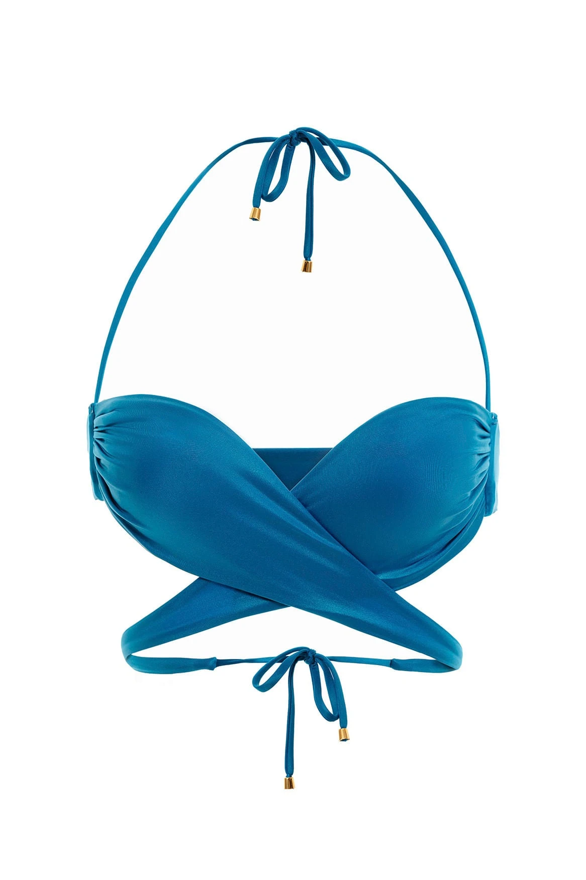 New Silhouette! The Harriet bikini top has a heart-shaped front, criss-cross straps around the waist, and adjustable back straps. An asymmetrical AB look. Without a doubt, a MUST HAVE of this collection. A special texturized blue fabric. Made with 86% Polyester