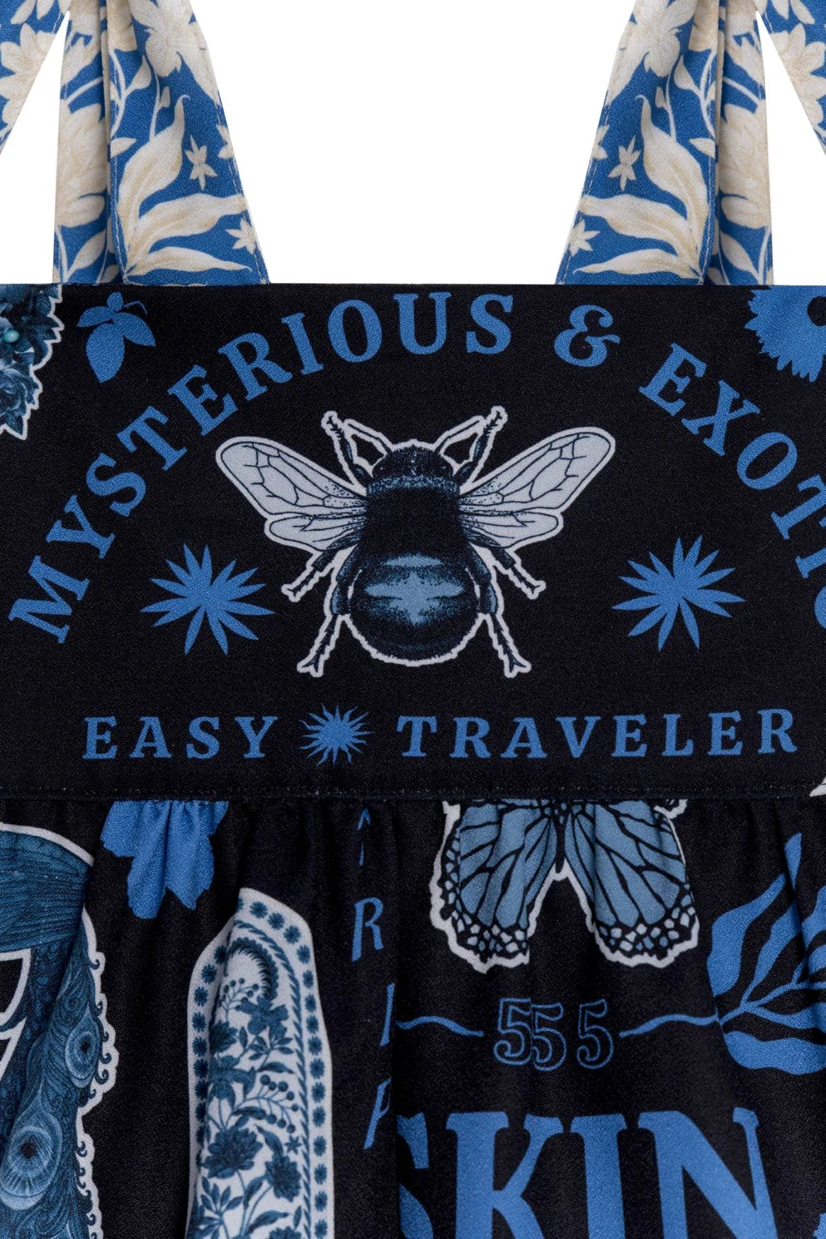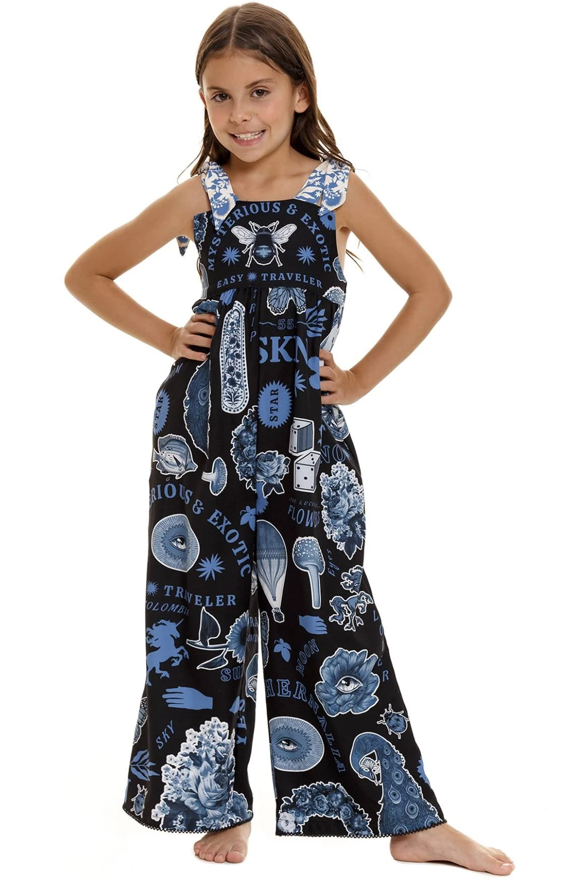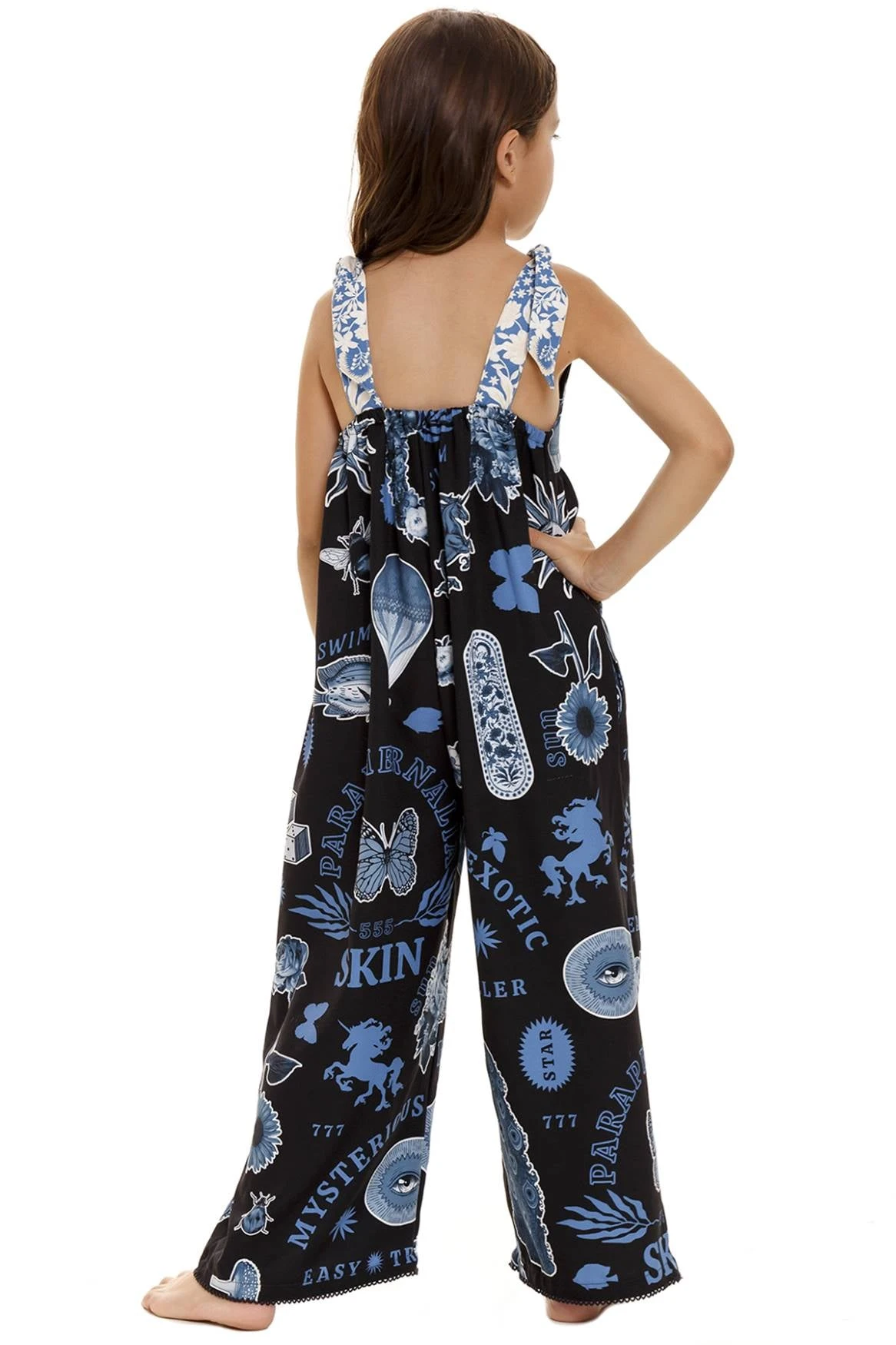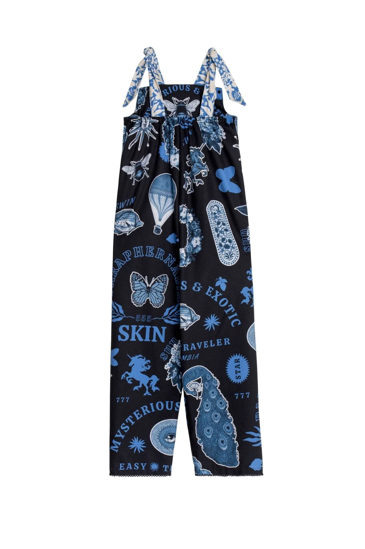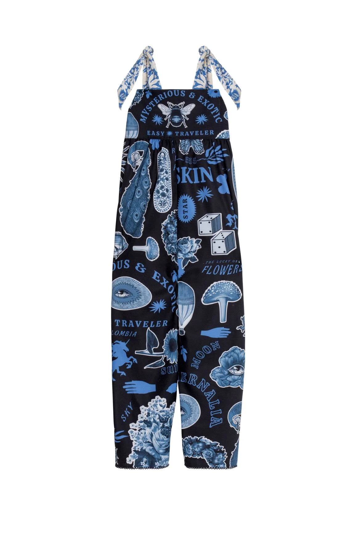 This easy wide-legged jumpsuit is decorated with tarot motifs and has broad shoulder ties for adjustability. The unique placement of magical elements gives it that handcrafted look.
