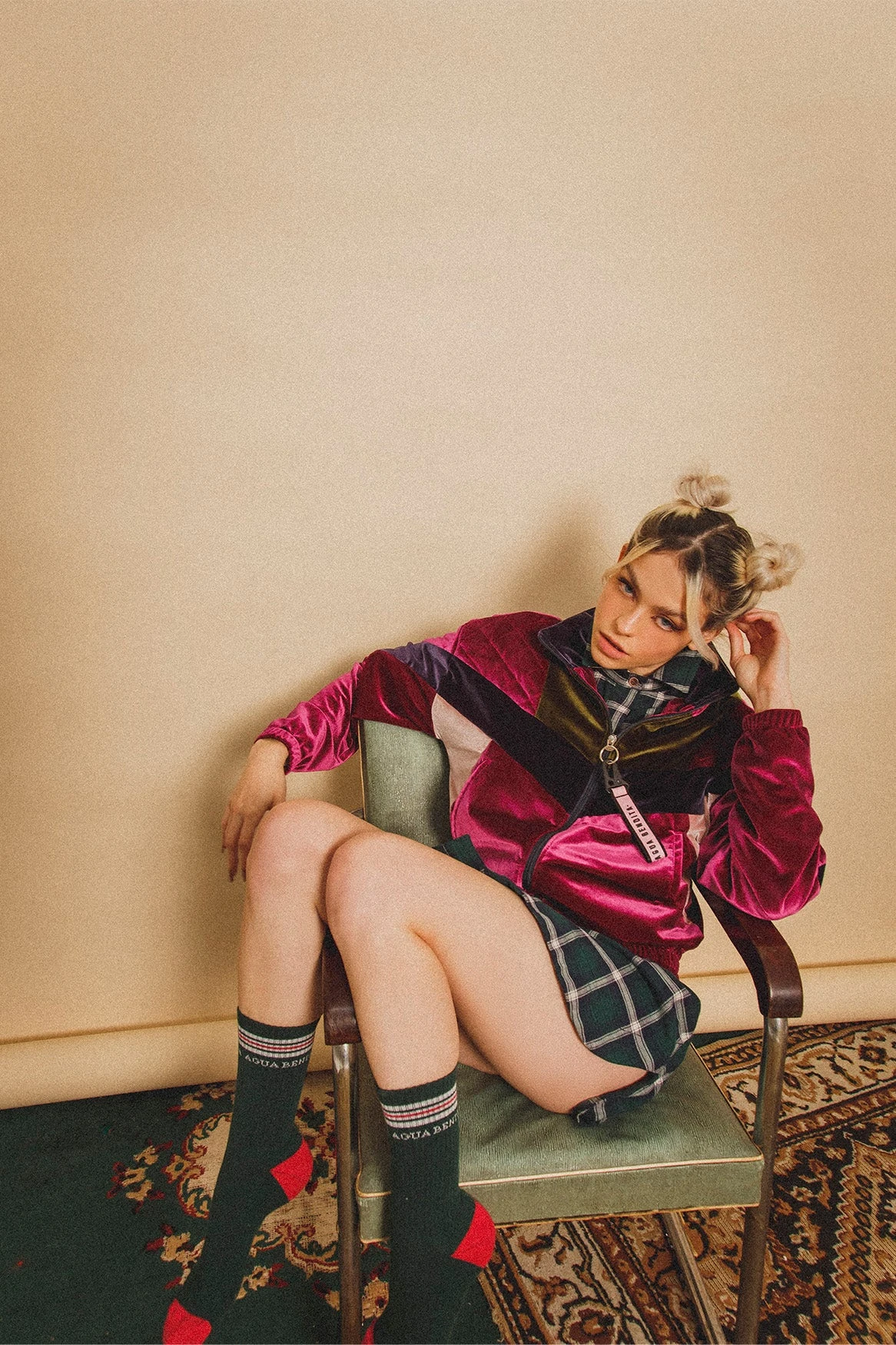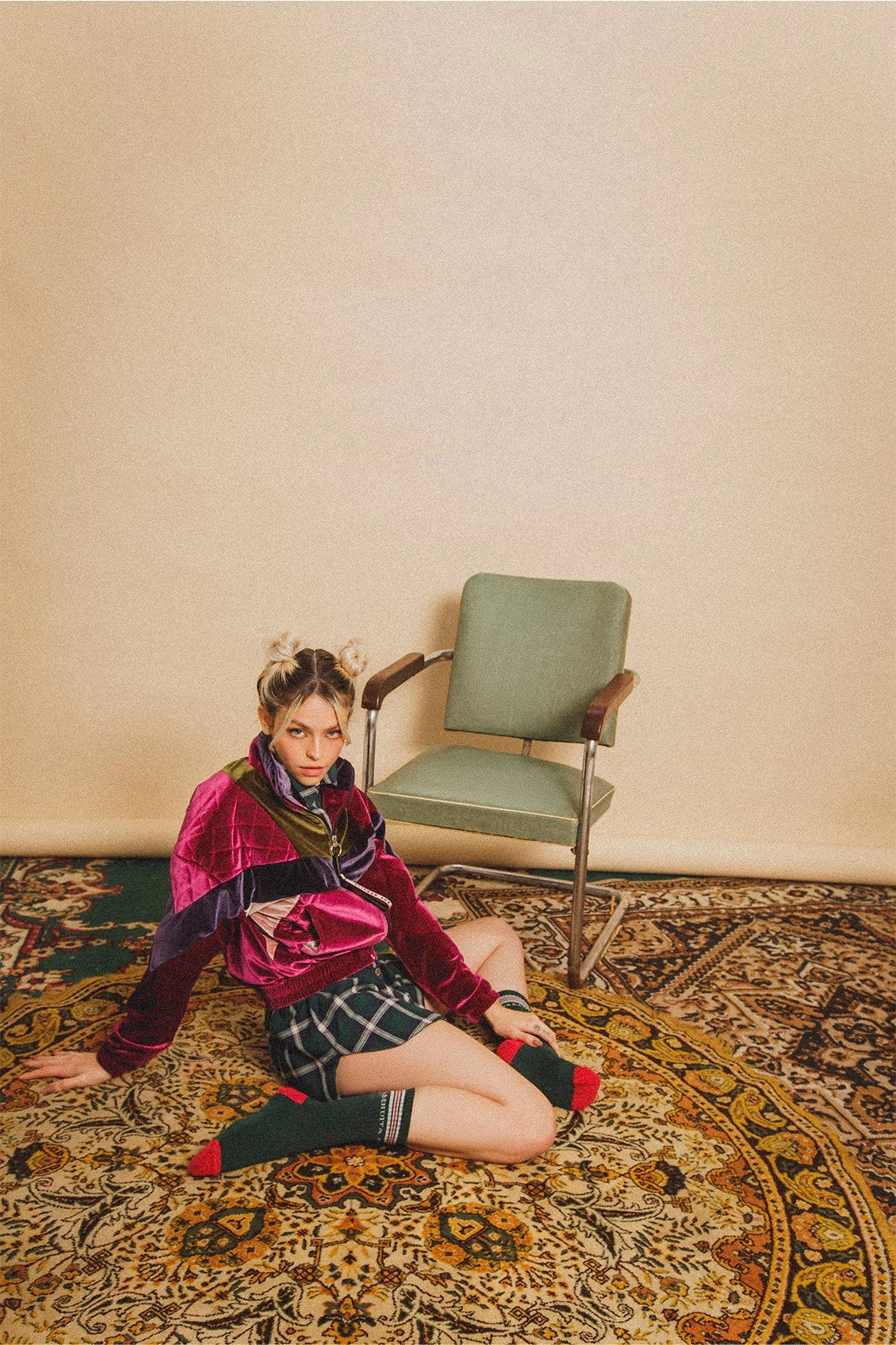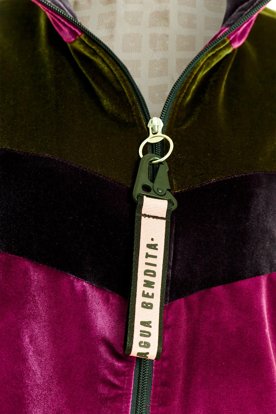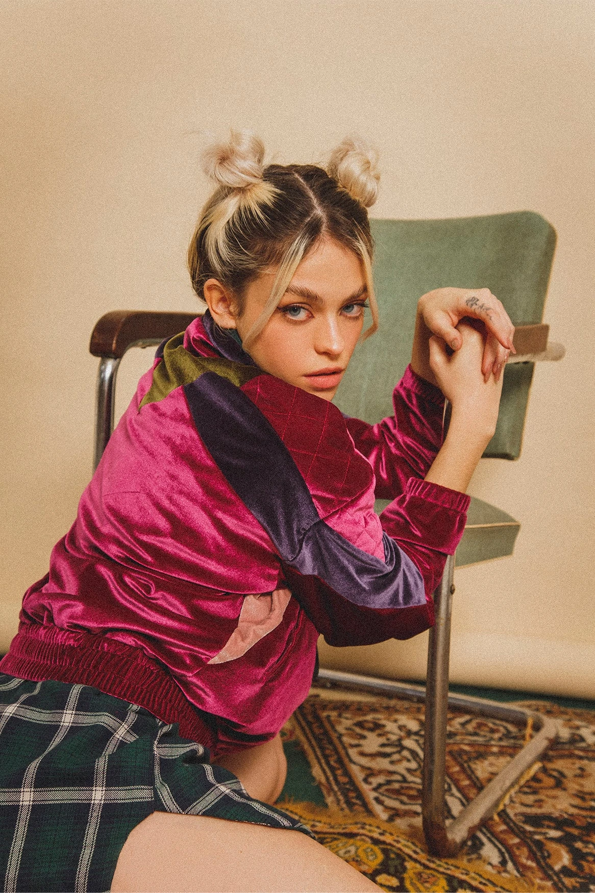 Key Look! Velvet jacket with full front zipper and side pockets, with contrasting color block details, and quilting on the shoulders. A key piece to make you stand out!