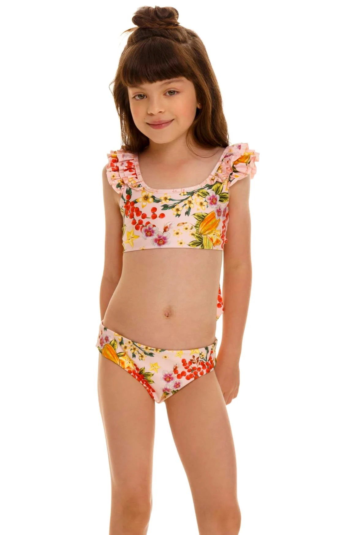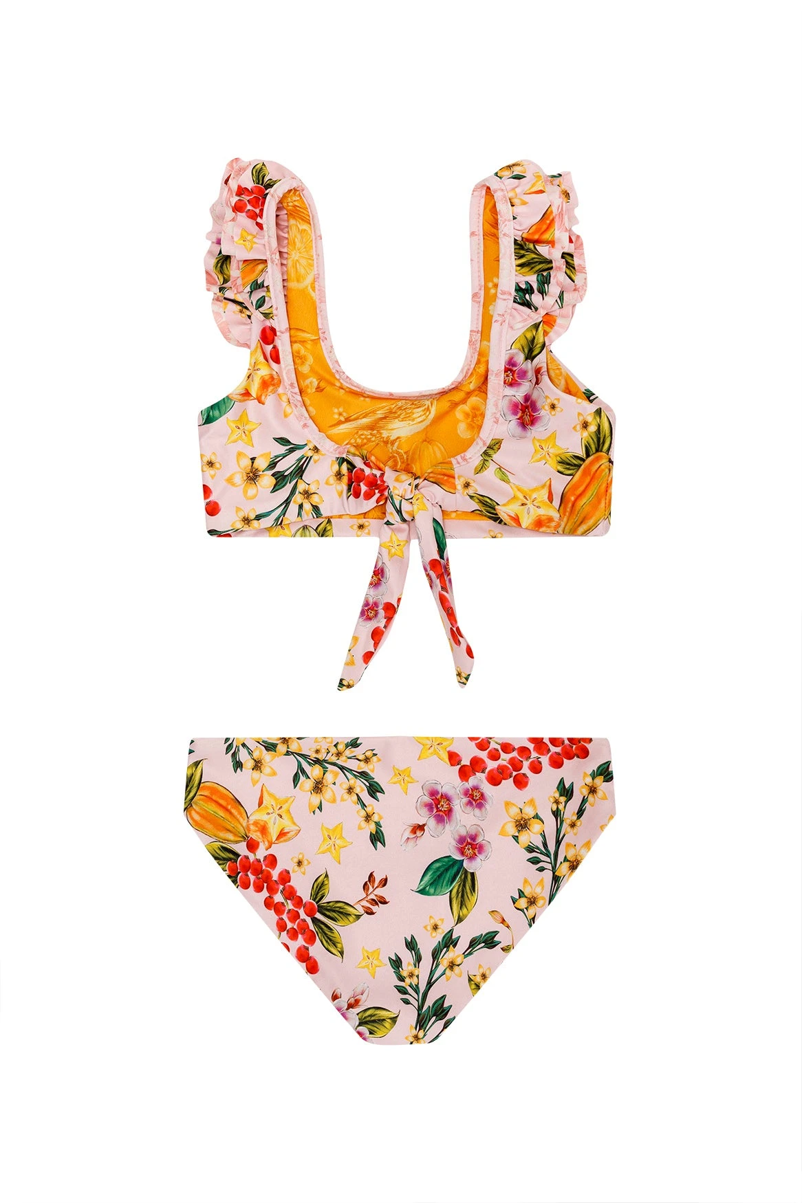 This bikini top is trimmed with rows of ruffles at the straps for a sweet and unique look. The back has a soft tie for adjustability, paired with clean, simple pants to finish the look. Perfect to have fun under the sun!