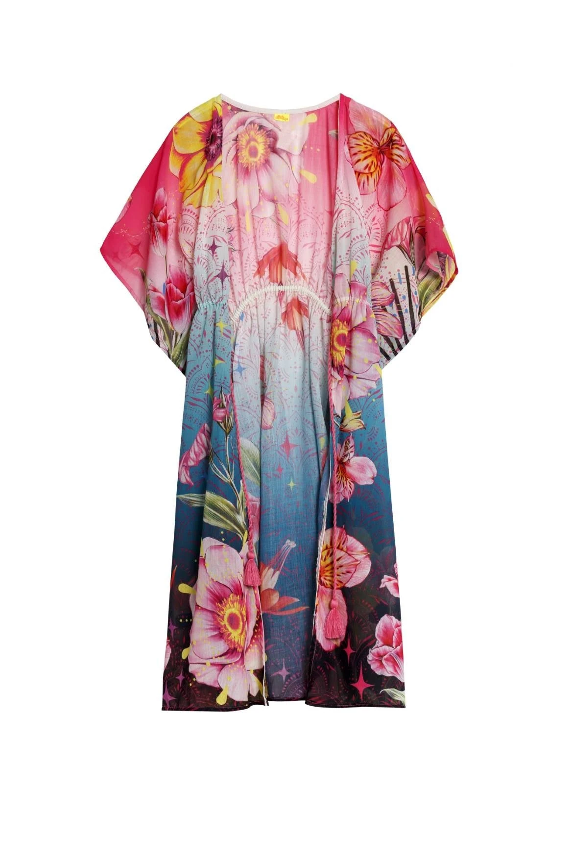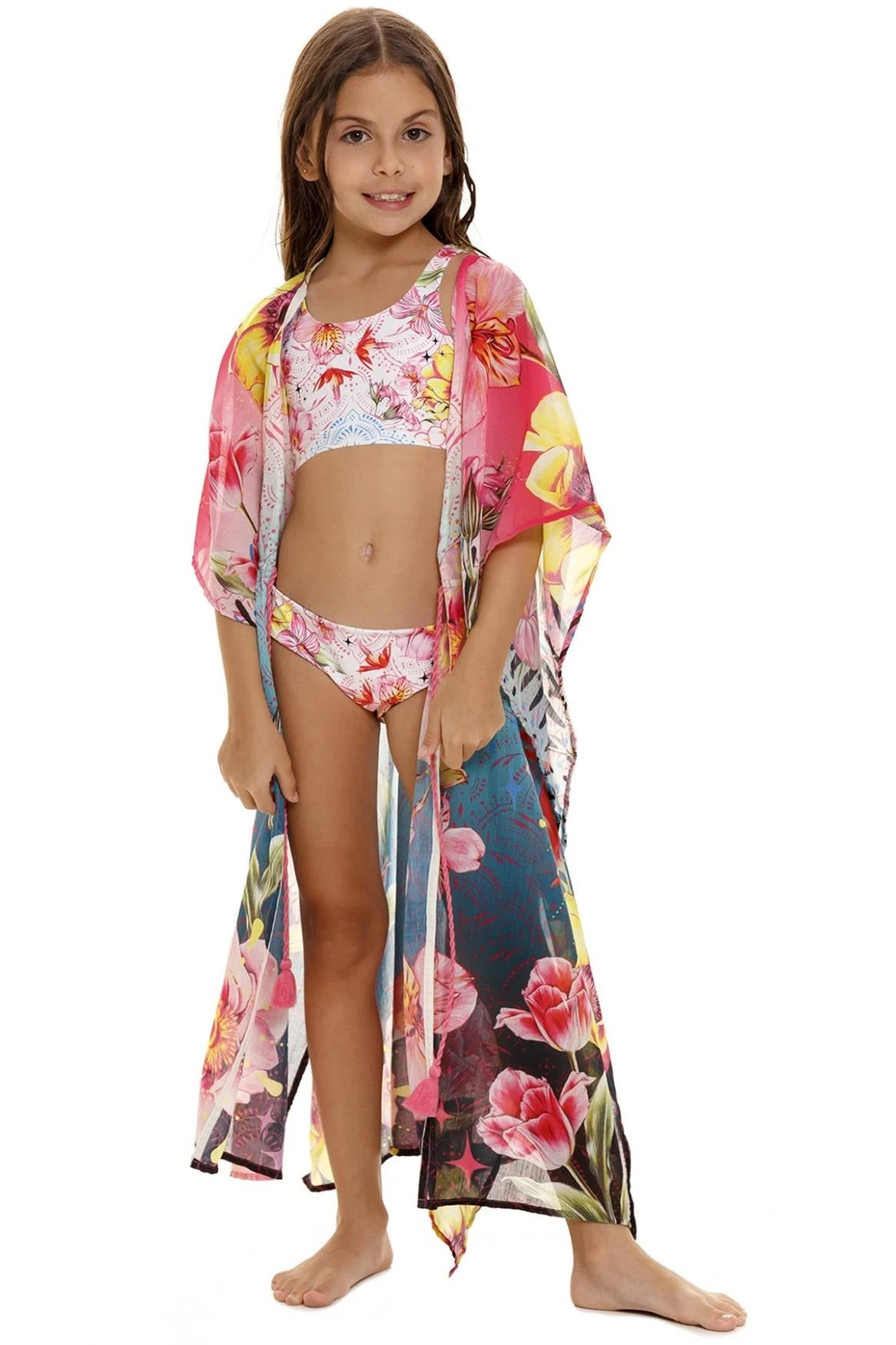 The Salma Kids Tunic is an open-front delight embellished with a twisted rope front tie and finished with drawstring tassels for adjustability. Our colorful cosmic prints and intricate details highlight the entire tunic for a handcrafted look. Your child will look and feel like a little beachside explorer in this charming tunic.