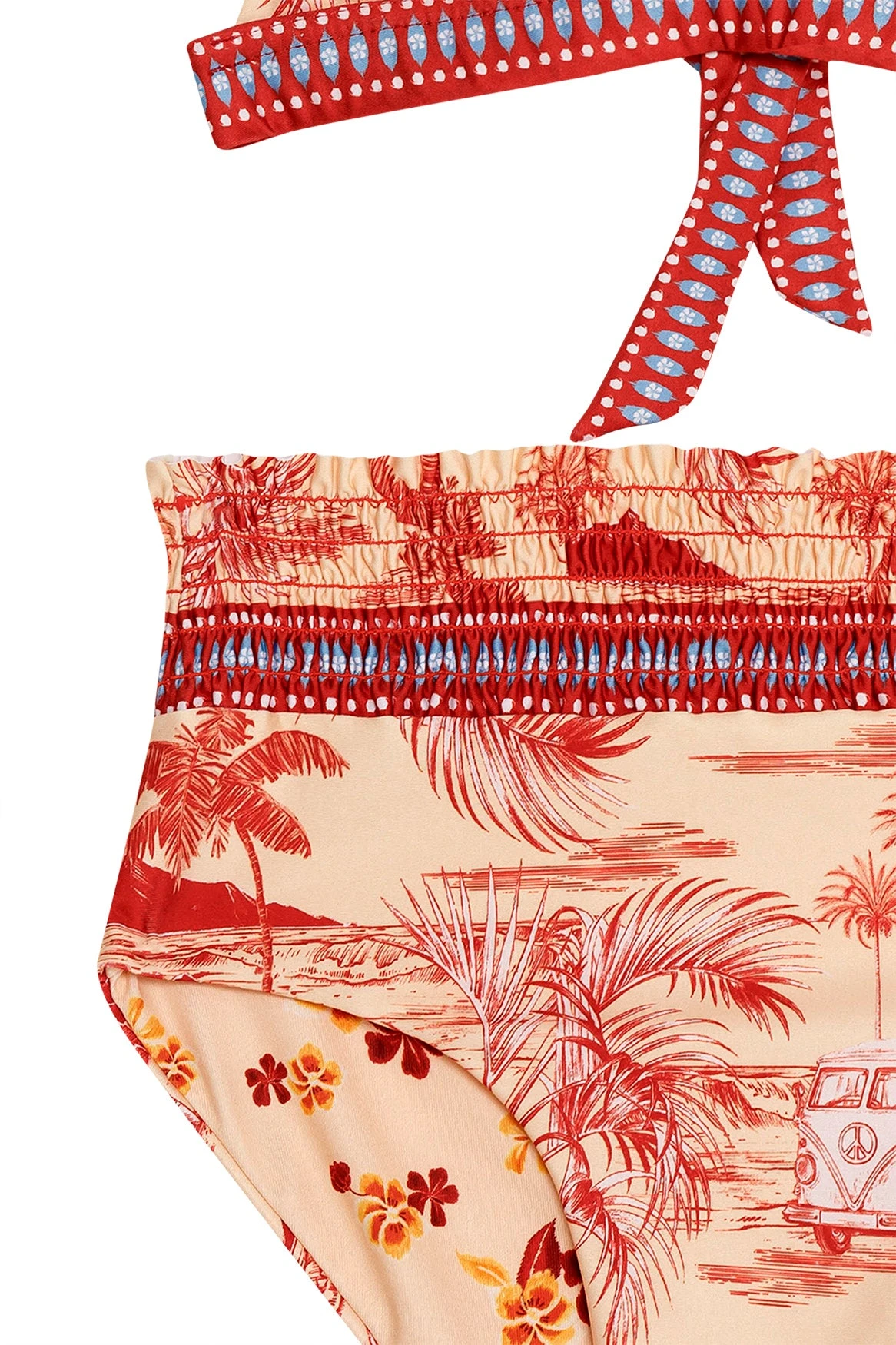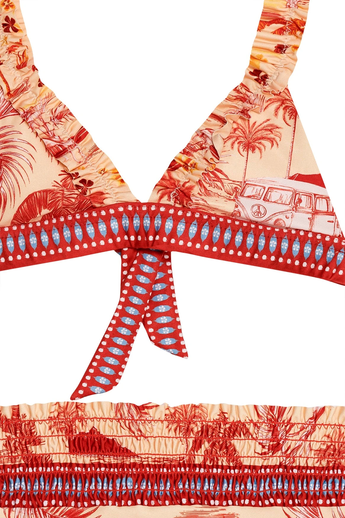 Make a statement in our eye-catching bikini top, featuring a ruffle neckline and ruffle straps for a feminine touch. The high waist bottom has a smocked waistband to ensure a comfortable and secure fit. Both pieces are accented with a colorful border that adds a handcrafted look to your beach outfit.
